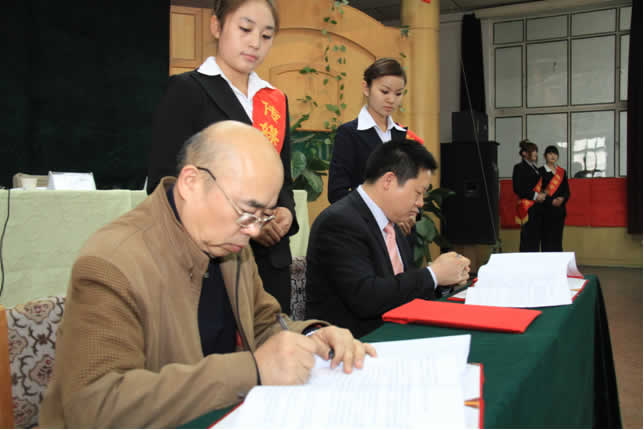 全體學生對校、企領導人的講話報以熱烈的掌聲,掌聲中,會展1011班的學生代表宣讀了《校企合作協議》,職業大學黨繼農校長、新疆振威張學林總經理交換簽署了協議。