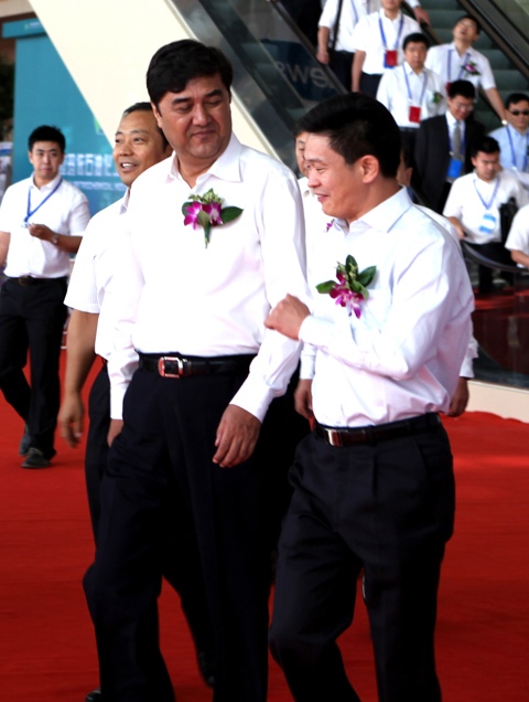新疆維吾爾自治區(qū)黨委副書(shū)記、自治區(qū)人民政府主席 努爾·白克力(左)與中國(guó)會(huì)展經(jīng)濟(jì)研究會(huì)副會(huì)長(zhǎng)、振威展覽集團(tuán)董事長(zhǎng) 張學(xué)山(右)等一行領(lǐng)導(dǎo)在展會(huì)現(xiàn)場(chǎng)參觀。