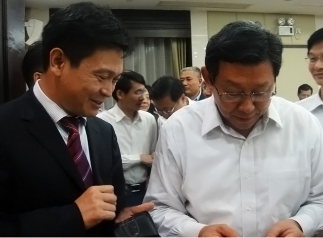 我司總經理張學山與商務部部長陳德銘(右)友好交談