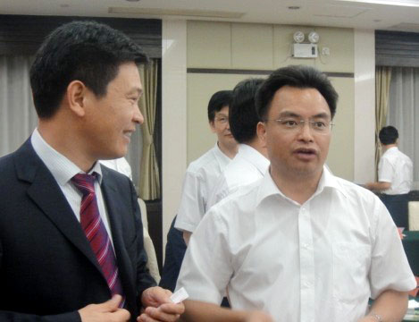 公司總經理張學山在廣州會展座談會與市委書記萬慶良(右)友好交談
