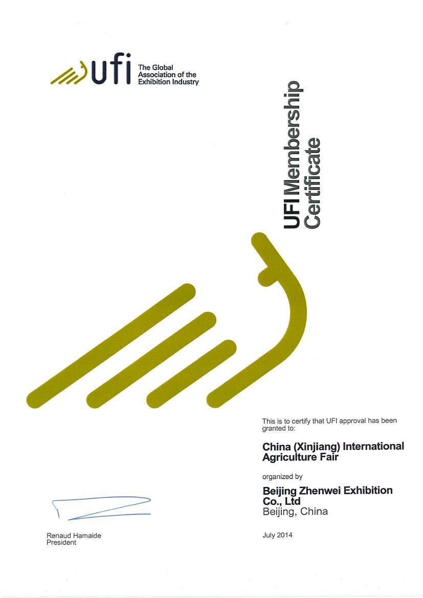 國際展覽業協會(UFI)通過對新疆農博會在展會規模、辦展歷史、國外參展商比例、國外觀眾的比例等方面進行嚴格評估分析的同時,在展會的服務、質量、知名度上也進行深入的觀察調研,于2014年7月15日批準新疆農博會通過UFI認證,在展會宣傳方面使用UFI認證標志,并將該展會納入UFI的全球推廣宣傳系統。