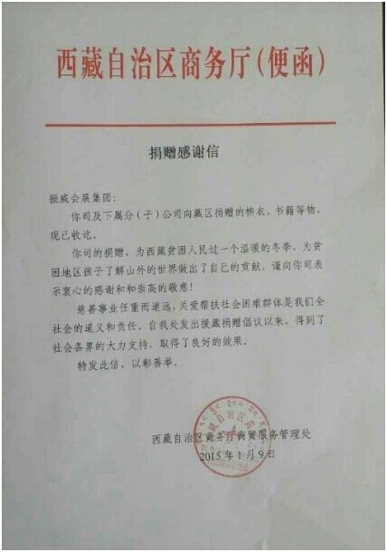 上圖為西藏自治區商務廳給我們發的感謝函,這是我們振威人共同努力行善的成果。