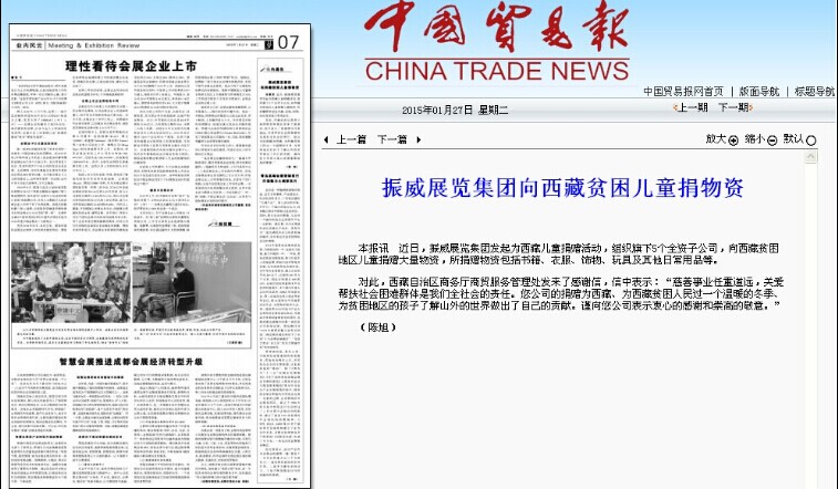 【中國(guó)貿(mào)易報(bào)報(bào)道】振威展覽集團(tuán)向西藏貧困兒童捐物資