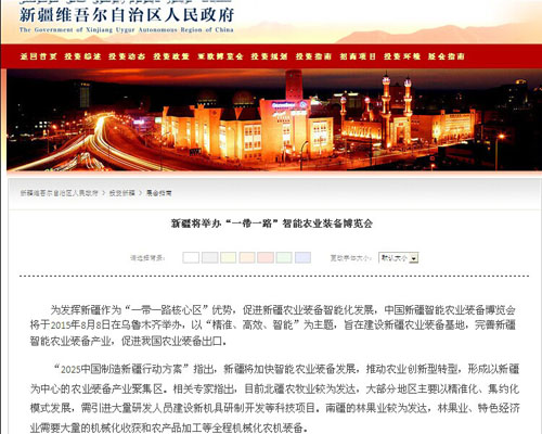 新疆自治區政府網:新疆將舉辦“一帶一路”智能農業裝備博覽會