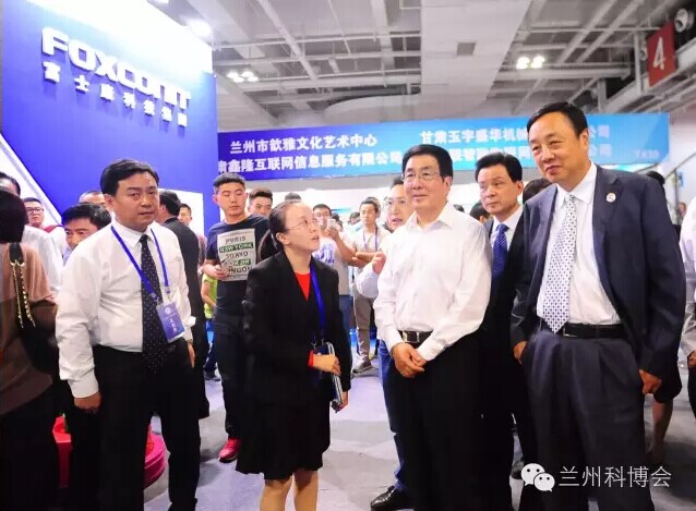 甘肅省委副書記、省長林鐸,甘肅省副省長郝遠(yuǎn)(右一)與蘭州市科技局黨組書記、局長王檸(左)參觀富士康展臺