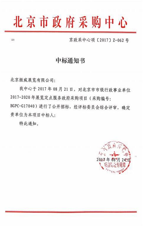 通過層層考核,經北京市政府采購中心評標委員會專業評審,北京振威于2017年8月24日接到《中標通知書》,成為北京市市級行政事業單位2017-2020年展覽定點服務政府采購項目中標單位。