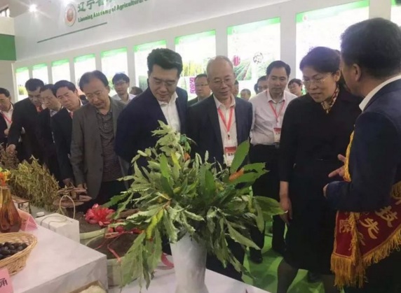 遼寧省副省長郝春榮(右二)、沈陽市副市長王廣生(右五)等政府領導在展會現場聽取遼寧省農業科學院專家講解