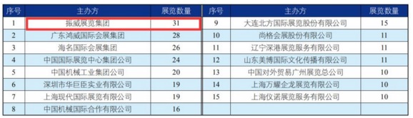 《中國展覽經濟發展報告(2018)》顯示,2018年共有15家國內組展企業辦展數量超過10個,有9家內地組展企業辦展數量超過15個。其中,振威展覽集團共舉辦 31 個展覽,辦展數量在國內組展企業中位居首位。