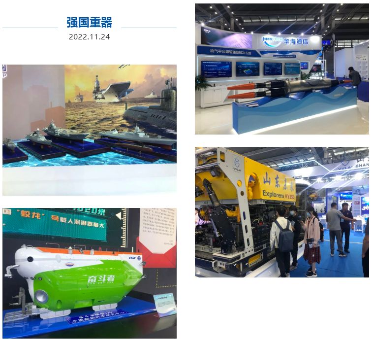 2022海博會參展企業帶來眾多國際一流、全國領先的創新技術和經略海洋“重器”。如中國船舶集團是世界唯一一家手持造船業“皇冠”上“三顆明珠”(航空母艦、LNG船和大型郵輪)訂單并將率先交付的造船集團。華海通信的全球首個32纖對海底線路分支器,將引領世界海纜行業新一代“靈活連接”技術變革。中集來福士制造了全球首臺模塊化風機艙,加快海上新能源開拓探索。中科院南方海洋實驗室的全球首艘智能型無人系統母船“珠海云”,可搭載數十臺空海潛無人觀測系統裝備。新技術、新產品不勝枚舉,高科技看點盡顯大國風范。